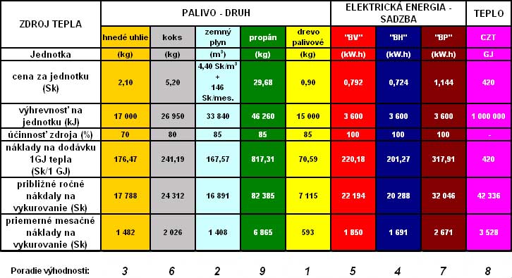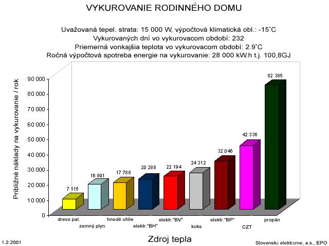 V snahe poskytnúť verejnosti čo najobjektívnejšie informácie, predkladá odbor Energetické poradenstvo SE, a.s. orientačné porovnanie nákadov na vykurovanie “modelového” rodinného domu so zadefinovanými tepelnými stratami a ročnou spotrebou energie na vykurovanie a ostatnú spotrebu elektriny v domácnosti (vychádzajúce zo štatistických údajov za rok 2000) pri v súčasnej dobe platných cenách. Zdôrazňujeme, že tento stav už zakrátko nemusí platiť, že ide o jeden z možných pohľadov, ktorý by mal pomôcť zorientovať sa pri voľbe vykurovacieho systému, nie univerzálny, nakoľko sme si vedomí, že aj v tomto porovnaní možno prakticky o každom spôsobe vykurovania polemizovať. V každom konkrétnom prípade preto doporučujeme urobiť variantné riešenia samostatne pre viac druhov dostupných palív a energie v danej lokalite. Pre objektívne porovnanie výhodnosti jednotlivých vykurovacích systémov je pochopiteľne nutné započítať aj zriaďovacie (investičné) náklady nielen na vlastný vykurovací systém, ale aj náklady na podmieňujúce investície, napr. na vybudovanie elektrickej či plynovej prípojky, pri vykurovaní plynom úpravu (vyvložkovanie) jestvujúceho komína, alebo možnosť inštalácie “turbokotla”, pri pevnom palive (koks, uhlie, palivové drevo) vybudovanie (možnosť) skládky a podobne.